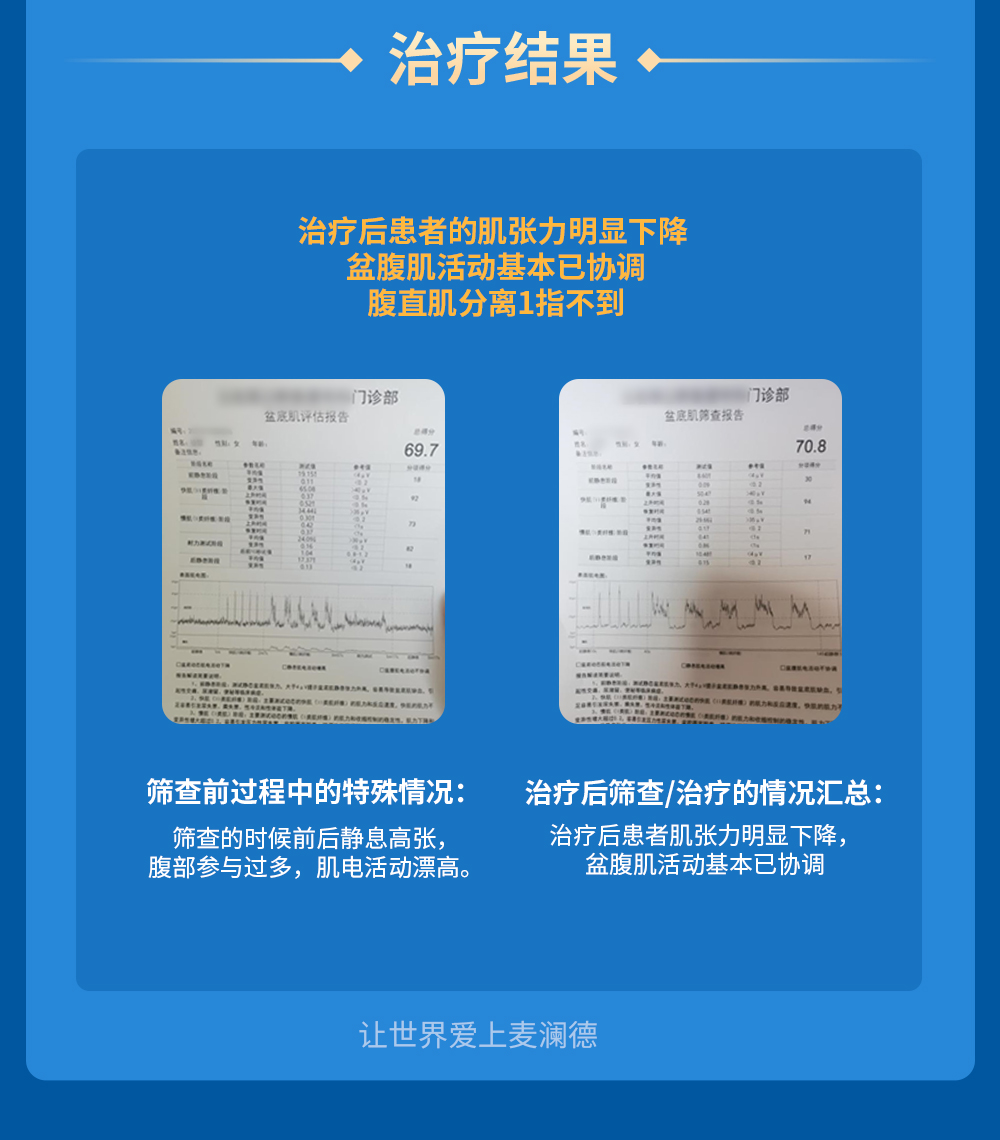 伟易博盆腔脏器脱垂案例 徐女士,56岁,诊断脏器脱垂,第一次评估35.3 中间治疗依性性很高,隔天一次来院盆底肌治疗,有配合家庭kegel训练,经盆底肌治疗一个月,再次评估73.2 ,现已继续第二疗程治疗