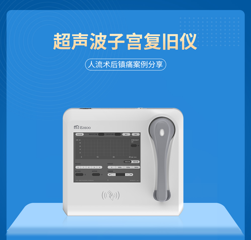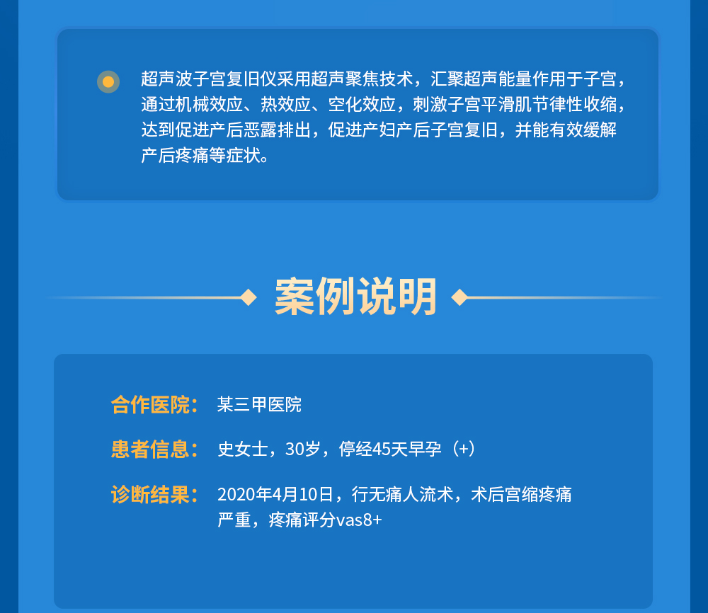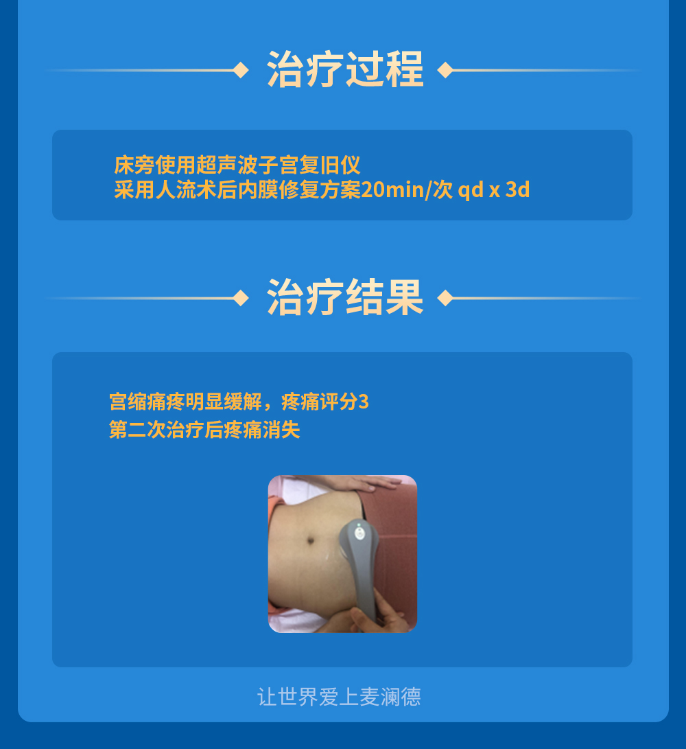 伟易博人流术后镇痛案例 患者:史女士, 30 岁 主诉&治疗情况: 停经 45 天早孕(+), 于 2020 年 4 月 10 日行无痛人流术, 术后宫缩痛疼严重,疼痛评分vas8+。 给予超声波子宫复旧 15 分钟/次 qd×3d,当天恢复后宫缩痛疼明显缓解,疼痛评分 3,第 二次治疗后疼痛消失。 恢复位置:耻骨联合以上
